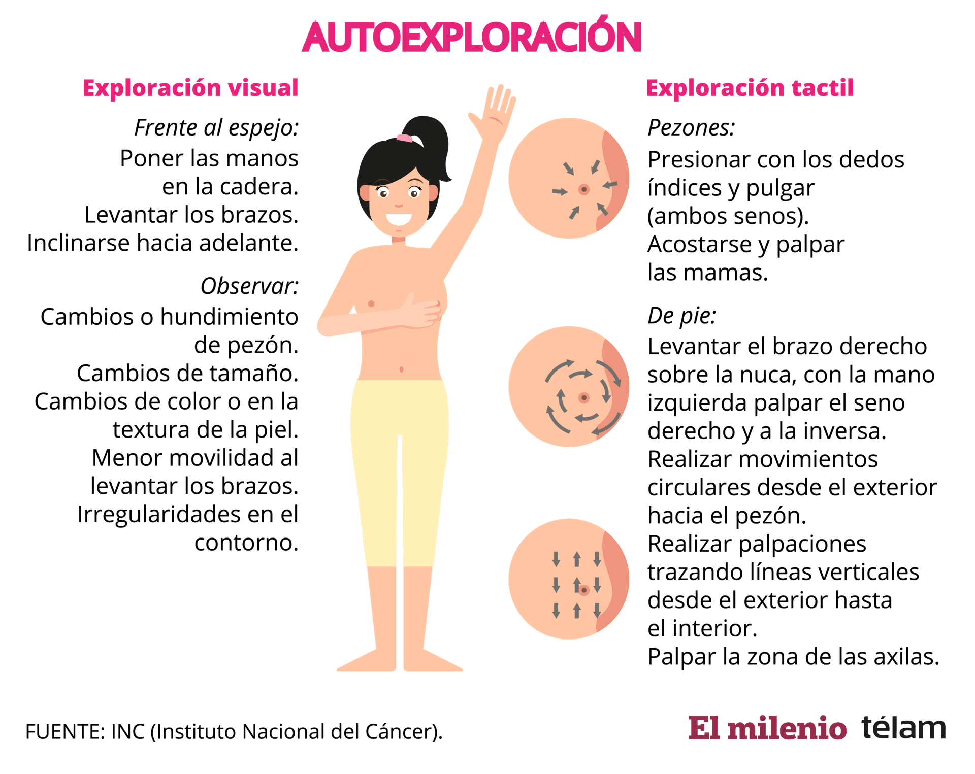 Acerca de la autoexploración, Contos consideró: “Es muy importante que la mujer aprenda a conocerse y de esta manera notar síntomas”. Y en cuanto a los signos más frecuentes, nombró: “engrosamiento y enrojecimiento de la piel, cambio en la forma o tamaño de la mama, inflamación completa o parcial, retracciones en la piel o el pezón, eccema en el pezón y secreción sanguinolenta por el pezón”.
