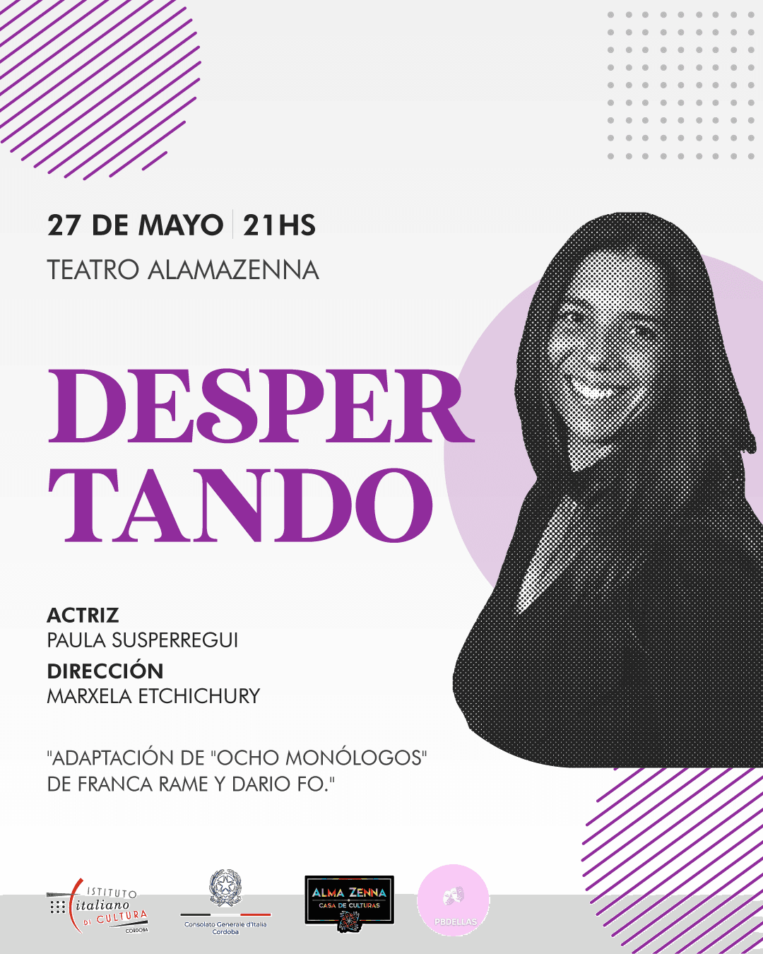 Por otro lado, el 27 de mayo será la función de El Despertar. Con la misma directora, la actriz Paula Susperregui abordará la historia de una joven urgida por el estrés cotidiano, que debe lidiar con las exigencias de la vida laboral y hogareña. A su vez, se suma la incomunicación e indiferencia de una pareja cuyo eje de vida pasa por dormir y ver partidos de fútbol en televisión.